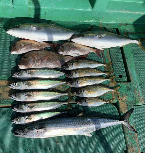 今日は、90cmのサワラと良型マダイ、メジロ、マアジ、マサバが上がりました!