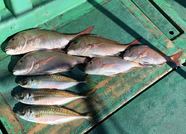 和泉市の車谷さんがマダイ41ー58cmを5尾、マアジ47ー49cmを3尾。